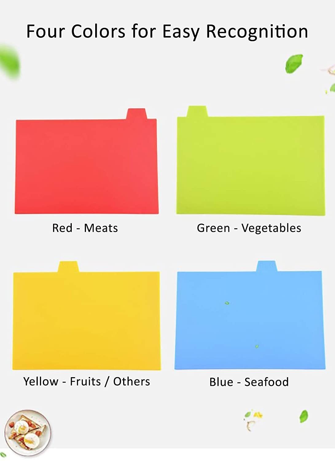 1.This 4 Pcs tabbed cutting mat set is not only a great value but available in a vibrant color coded series with food icons. These easily identifiable colors and food icons helps prevent cross contamination while bringing life into your kitchen.