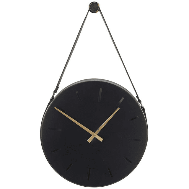 Decmode 16" black stainless steel wall clock with leather hanging straps is a unique addition to your stylish home. Decorate your walls and tell time in style with this open frame wall clock, which easily elevates an industrial console table with modern decorative items. Clock requires one aa battery. Battery not included. This item ships in 1 carton. Furnished with cut-out hour markers and gold clock hands. The clock mechanism runs silent. Stainless steel wall clock makes a great gift for any occasion. Can be hung vertically using the leather strap; nails and screws not included. Suitable for indoor use only. This item ships fully assembled in one piece. Made in india. This is a single black colored kitchen clock. Industrial style.