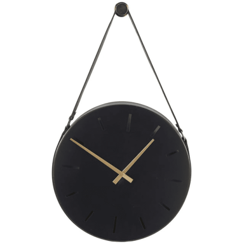 Hanging wall clock features a matte black clock face with metallic gold clock hands and mounted hook, which is complemented by the brown leather straps