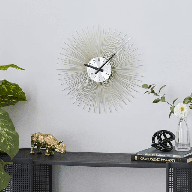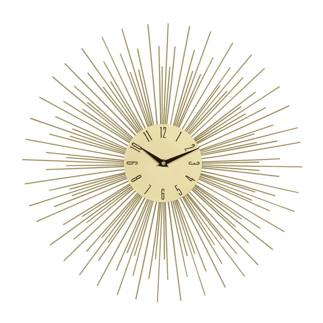 Decmode 19" gold metal starburst wall clock is a unique addition to your stylish home. Features sunbursts of varying lengths coming from the clock face. Requires 1 aa battery. Battery not included. This item ships in 1 carton. Arabic numerals for the hour markers. The clock mechanism runs silent. Iron wall clock makes a great gift for any occasion. Can be hung vertically using the keyholes on the back; nails and screws not included. Suitable for indoor use only. This item ships fully assembled in one piece. This is a single gold colored kitchen clock. Contemporary style.