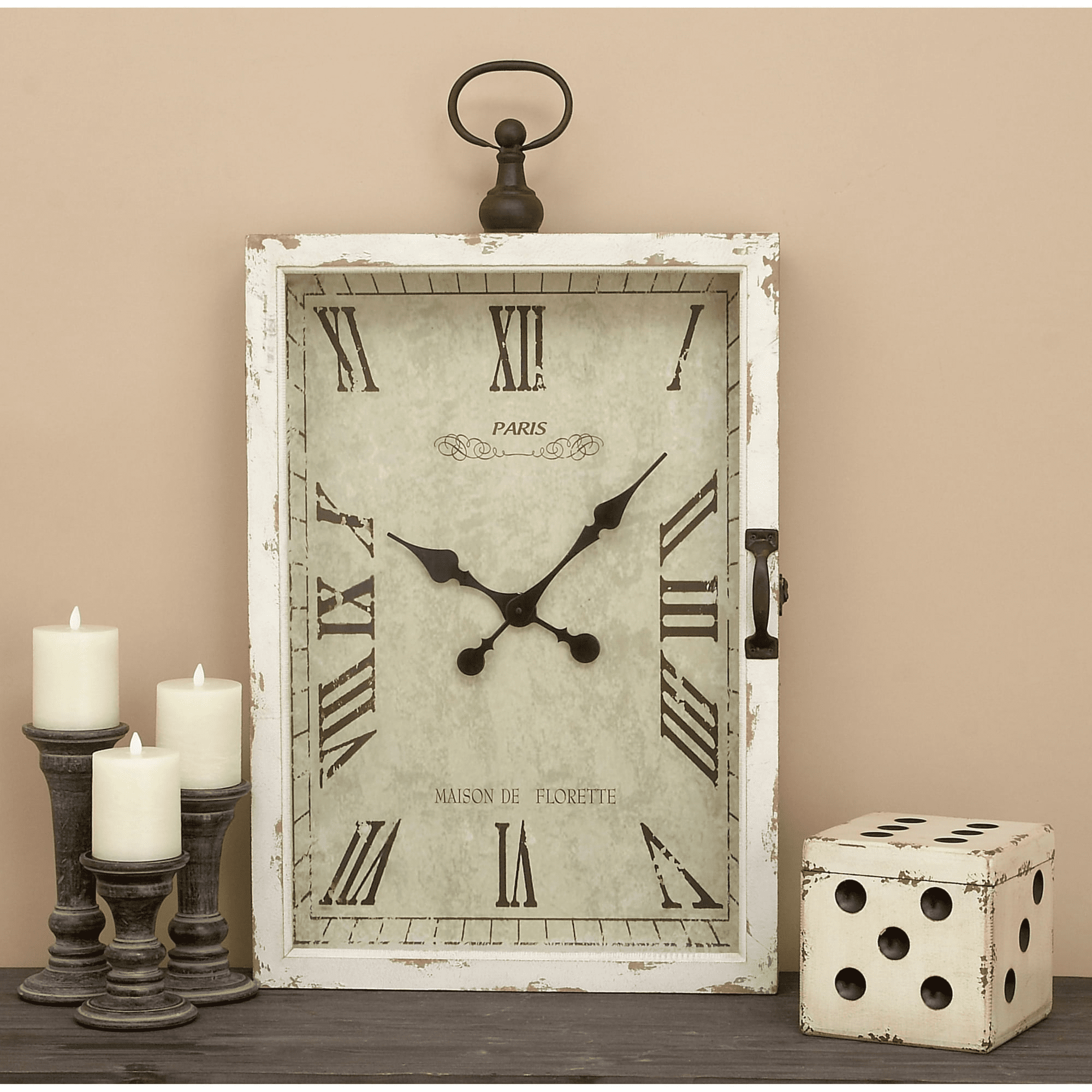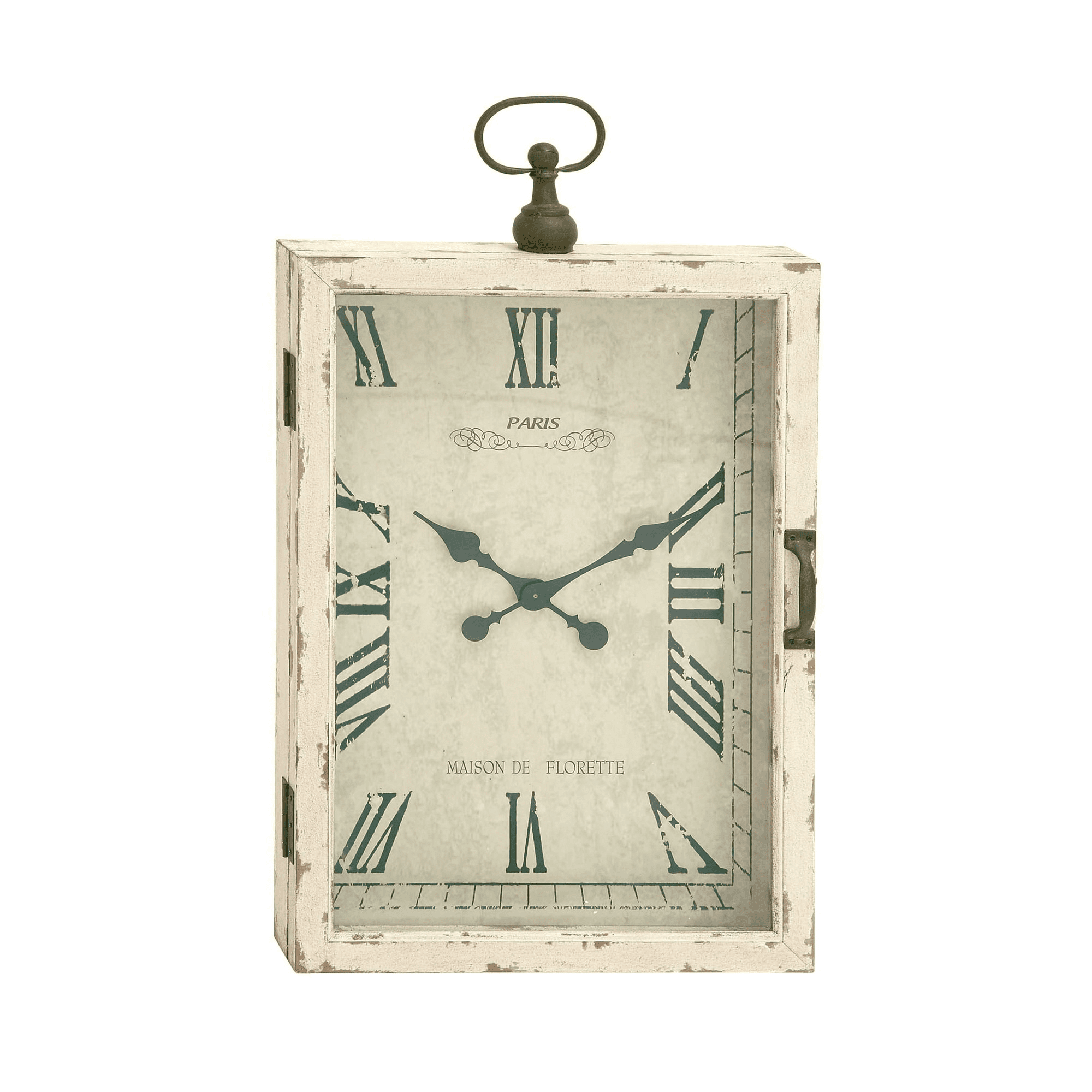 Features vintage-style dial with black clock hands and roman numerals, contains a white box frame with cabinet-style iron latched glass door and handle