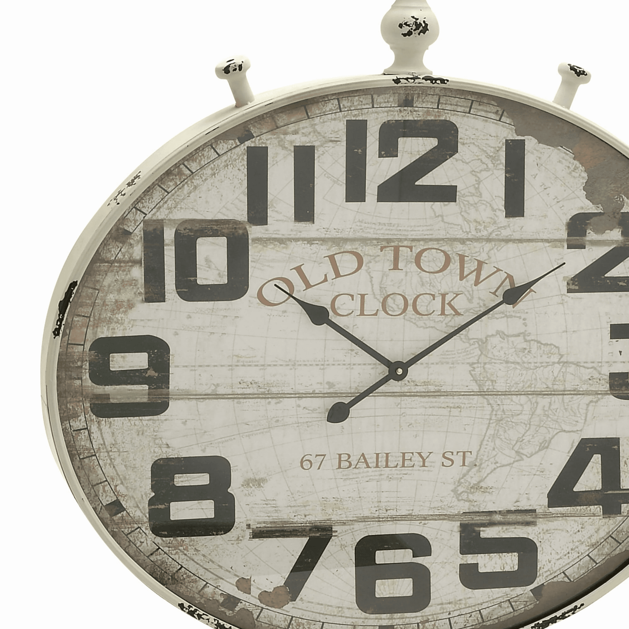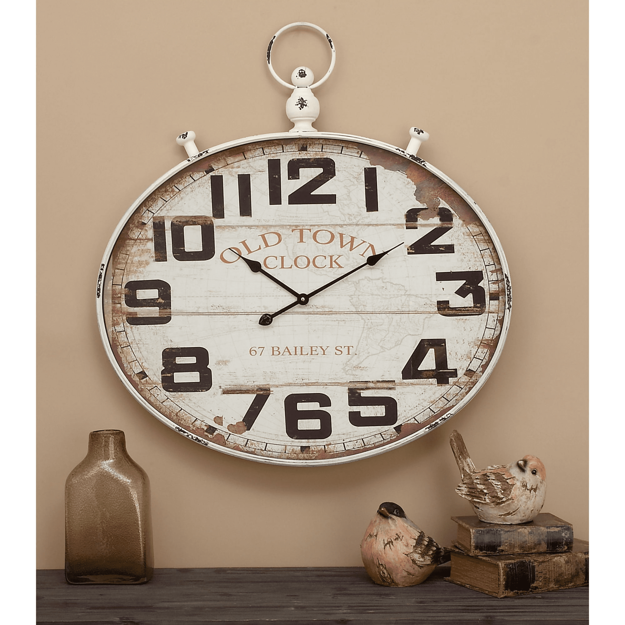Decmode 36" white metal pocket watch style wall clock is a unique addition to your stylish home. This oversized wall clock makes for a perfect addition to a pale and warm color palette with creme, clay, rust orange, dark brown, and off-white hues. Requires 1 aa battery, not included. This item ships in 1 carton. Arabic numeral with hour and minute markings and black clock hands. The clock mechanism runs silent. Can be hung vertically using the keyholes; nails and screws not included. Suitable for indoor use only. This item ships fully assembled in one piece. This is a single white colored oversized wall clock. Vintage style. The clock features the words "Old town clock, 67 bailey street".