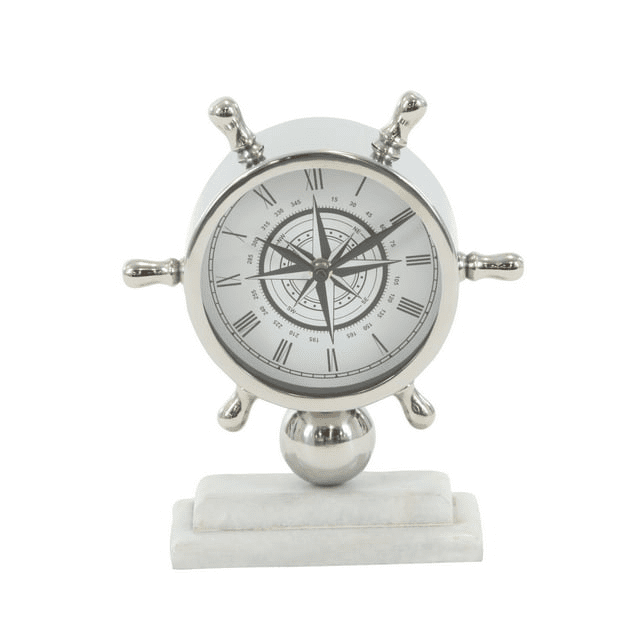 Improve your time management skills and keep a clock close by with this charming piece. A dashing display on any surface to help you manage your time throughout the day. Placed on your office or library shelves, tables, or consoles, this clock is an eye-catching and timeless addition to your home space. Requires 1 aa battery. Battery not included. This item ships in 1 carton. Clock face features roman numerals for hour markers. The clock mechanism runs silent. Suitable for indoor use only. Made in india. Coastal style. Decmode 8" silver stainless steel ship wheel clock with marble base