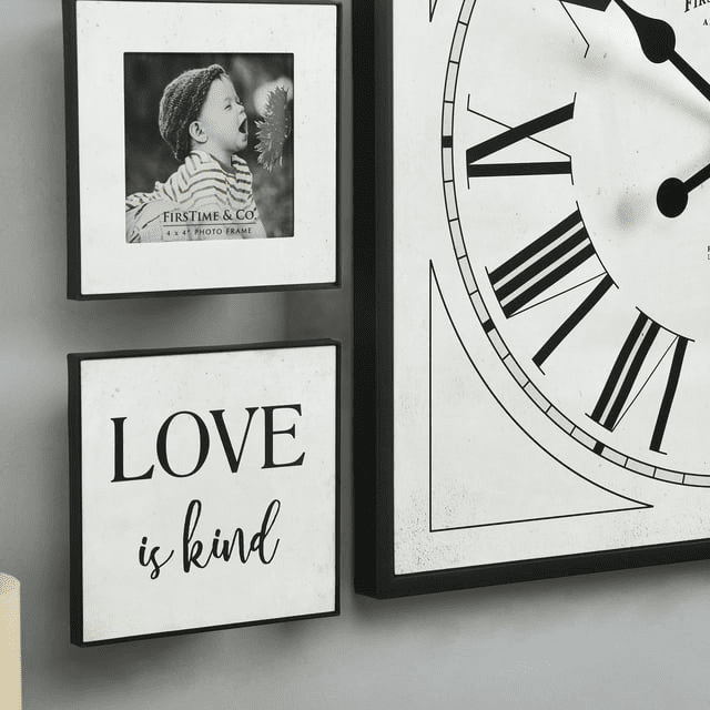 Wall decor is a great way to express your personal style within your home. Share your love for your family and friends on your walls with our firstime & co.® love gallery 7 piece set. This creative gallery set features a 20' by 20' clock with large, easy-to-read roman numerals. Three 6' by 6' plaques compliment the ensemble with the phrases, 'love is patient,' 'love is kind' and 'love never fails.' finally, the set includes 3 6' by 6' photo frames that fit 4' by 4' photos. Take this treasured gift set home today! Finding the right wall decor to suit your style has never been easier thanks to our wide range of firstime & co.® timekeeping solutions.