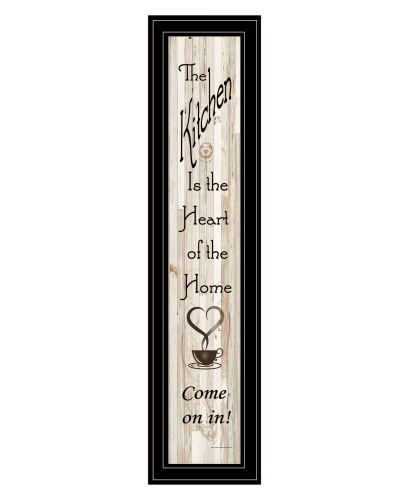 ME26630-704G "Kitchen is the Heart of the Home" is designers and created at Trendy Decor 4U this vertical framed wall art is 9"x33" black frame print. This perfect kitchen decor features a shiplap background with the curly script reading "The kitchen is the heart of the home come on in!" In the corner of the print there is a coffee cup with steaming rowing up into a heart. Our products are proudly made by skilled American workers. The surface of our framed art is textured with a fade resistant coating, so no glass is necessary. A vegetable-based glue is used in the production of our products, and our frames are crafted from 100% recycled material. In keeping with our environmentally friendly approach toward manufacturing. To view a vignette: VME648V-226G•Print has fade resistant surface texture, no glass is necessary•Woman Owned Business (WBE)•Arrives ready to hang, no additional hardware needed on item•IndIvIdually hand crafted by skilled AmerIcan workers•Clean with Soft Dry Cloth Only
