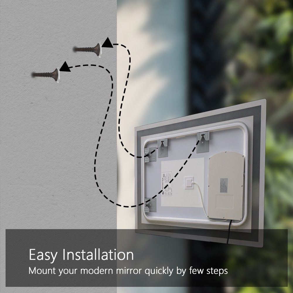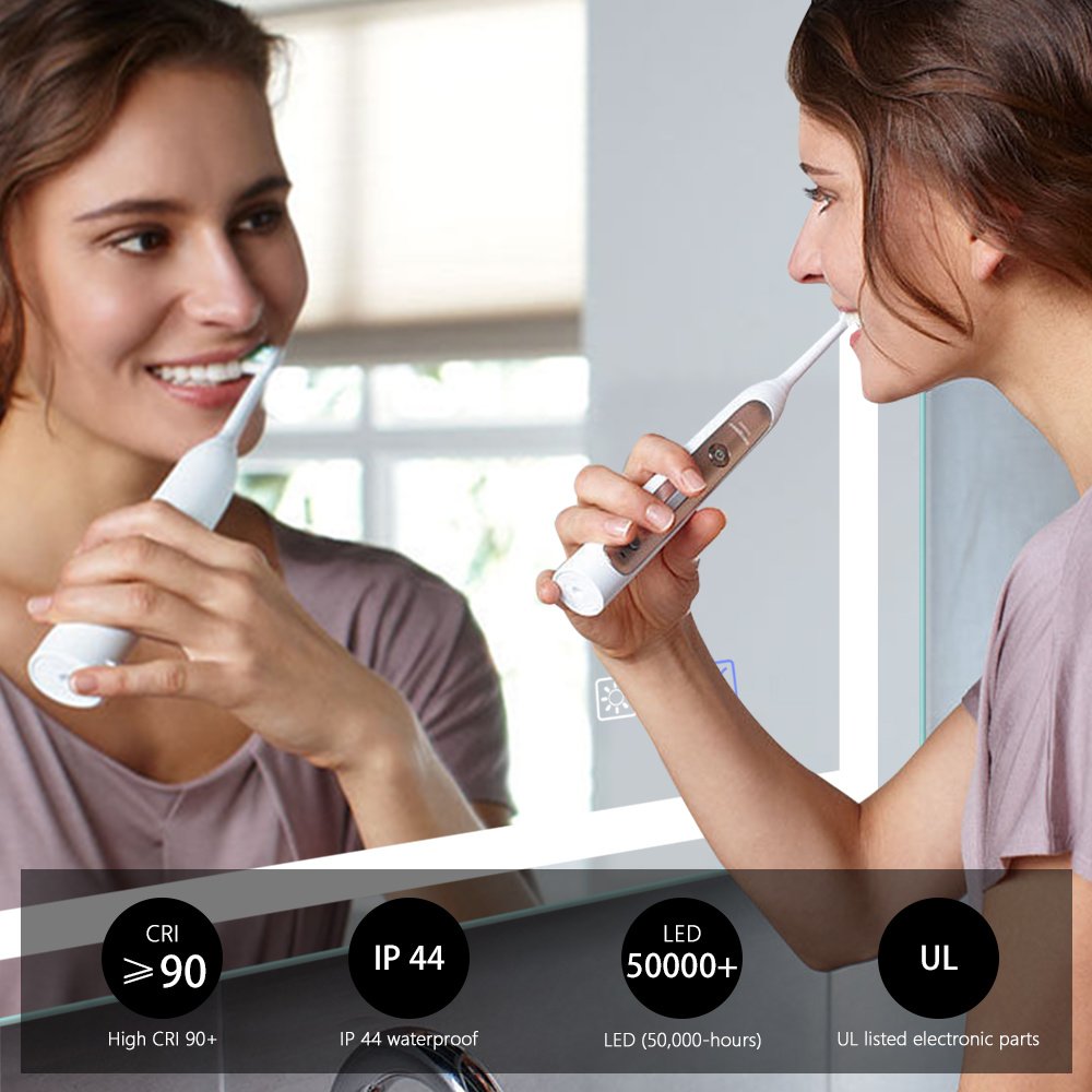 ●Experience the Luxury of a Bathroom at Home:You may have seen large, gorgeous LED bathroom mirrors in hotels and restaurants. Now, you can bring the same modern feeling to your own home with our LED bathroom mirror. Transform your powder room into a Hollywood star's makeup space and enjoy a bathroom that will impress friends and family.●Enhanced Visibility with Anti-fog Technology:Our LED mirror for bathroom comes with an anti-fog feature, providing a clear reflective lighted bathroom mirror experience even in a foggy bathroom. Say goodbye to water droplets or fog that blur your LED bathroom mirror. The individually designed anti-fog switch ensures safety and energy efficiency. You can easily turn it on or off according to your needs.●Adjustable Lighting for the Perfect Ambience: Our Bathroom Mirror With Light offers color temperature 5000K. Adjust the brightness of the bathroom mirror with lights from 15% to 100% lumens to suit your preferences. ●Safety Enhanced with Explosion-proof Film: Our LED bathroom mirror with lights uses safe and high-quality explosion-proof glass. In the event of breakage, the bathroom vanity mirror will not produce hazardous glass splinters, providing added safety and peace of mind.●Backlit+Front-lit, Double Lighting Sources: Our LED bathroom mirror is designed with both backlight and front light. Double lighting sources designed to make the mirror bright enough for you to do makeup, skin care, shaving and dressing up. Super bright.