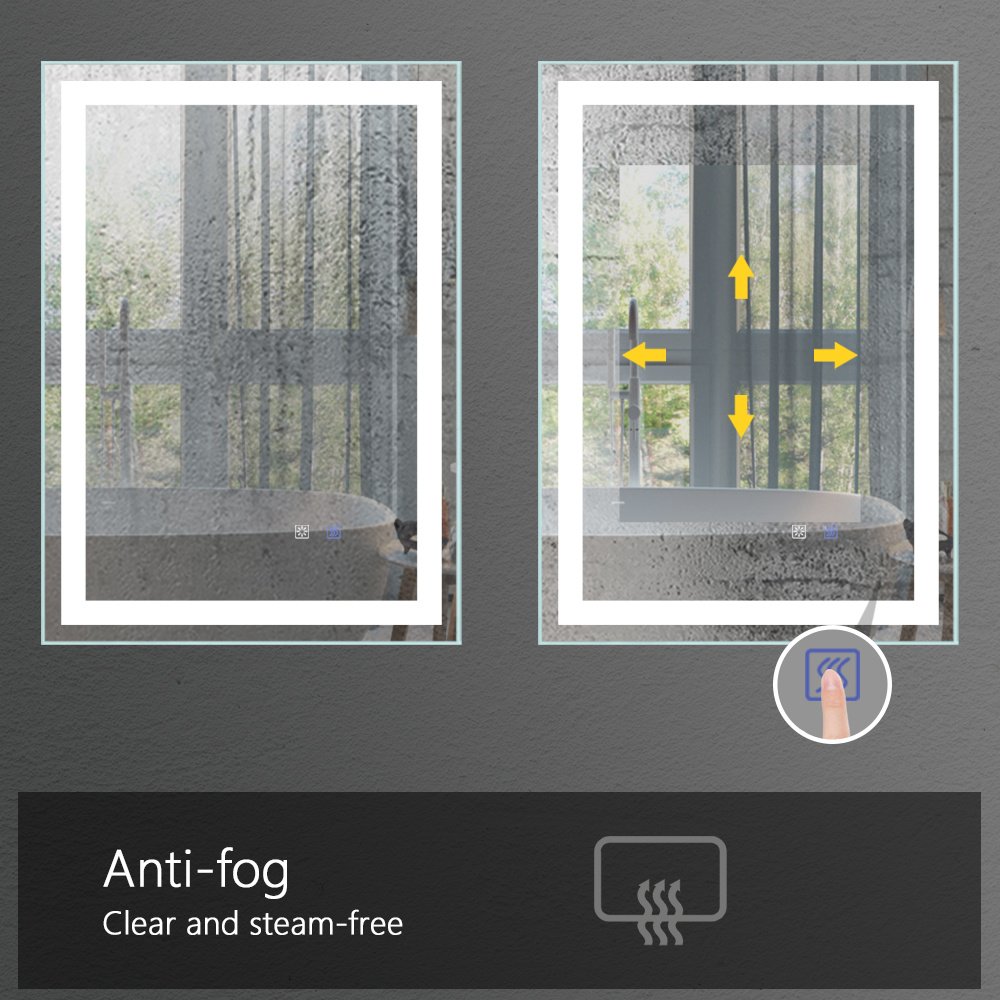 [Enhanced Visibility with Anti-fog Technology] Our LED mirror for bathroom comes with an anti-fog feature, providing a clear reflective lighted bathroom mirror experience even in a foggy bathroom. Say goodbye to water droplets or fog that blur your LED bathroom mirror. The individually designed anti-fog switch ensures safety and energy efficiency. You can easily turn it on or off according to your needs.