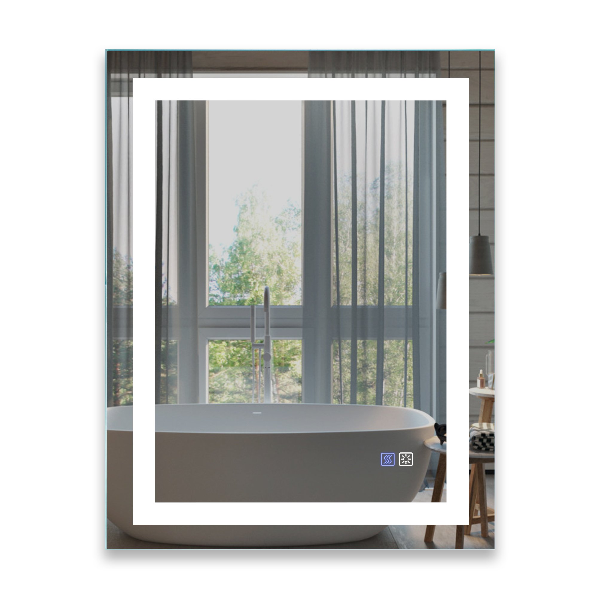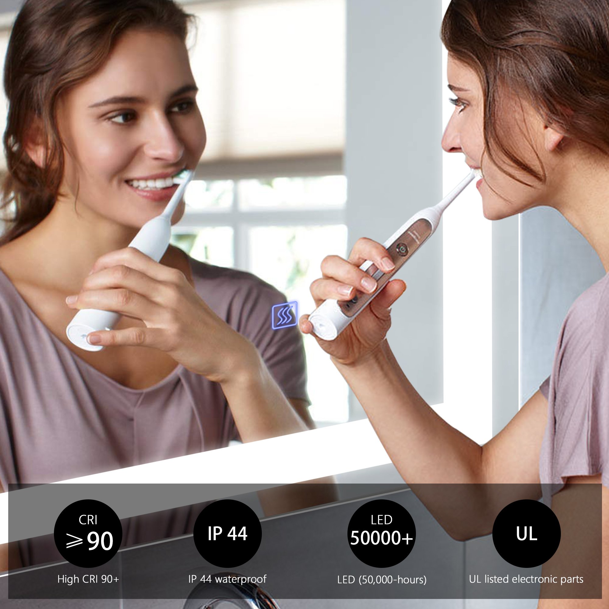 [Enhanced Visibility with Anti-fog Technology] Our LED mirror for bathroom comes with an anti-fog feature, providing a clear reflective lighted bathroom mirror experience even in a foggy bathroom. Say goodbye to water droplets or fog that blur your LED bathroom mirror. The individually designed anti-fog switch ensures safety and energy efficiency. You can easily turn it on or off according to your needs.