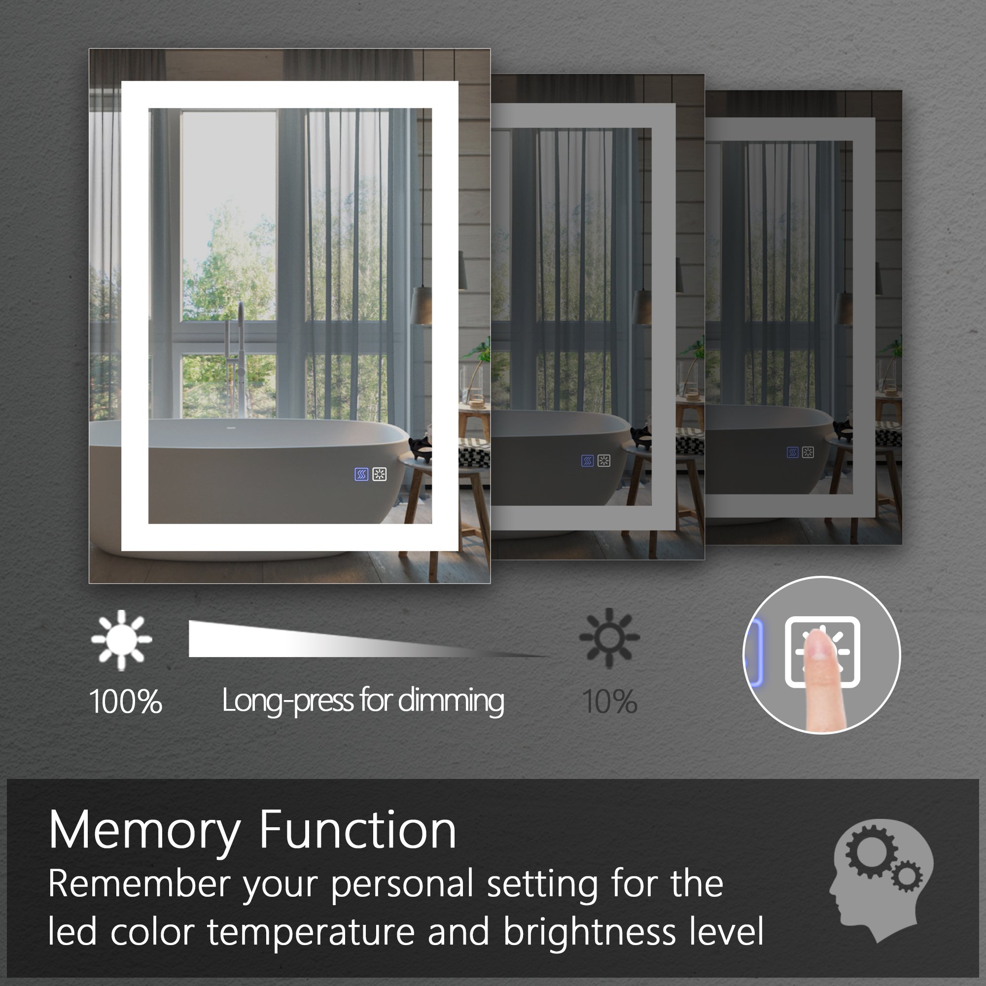 [Adjustable Lighting for the Perfect Ambience] Our Bathroom Mirror With Light offers color temperature 5000K. Adjust the brightness of the bathroom mirror with lights from 10% to 100% lumens to suit your preferences.