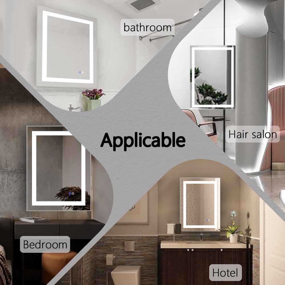 ●Experience the Luxury of a Bathroom at Home:You may have seen large, gorgeous LED bathroom mirrors in hotels and restaurants. Now, you can bring the same modern feeling to your own home with our LED bathroom mirror. Transform your powder room into a Hollywood star's makeup space and enjoy a bathroom that will impress friends and family.●Enhanced Visibility with Anti-fog Technology:Our LED mirror for bathroom comes with an anti-fog feature, providing a clear reflective lighted bathroom mirror experience even in a foggy bathroom. Say goodbye to water droplets or fog that blur your LED bathroom mirror. The individually designed anti-fog switch ensures safety and energy efficiency. You can easily turn it on or off according to your needs.●Adjustable Lighting for the Perfect Ambience: Our Bathroom Mirror With Light offers color temperature 5000K. Adjust the brightness of the bathroom mirror with lights from 10% to 100% lumens to suit your preferences. ●Safety Enhanced with Explosion-proof Film: Our LED bathroom mirror with lights uses safe and high-quality explosion-proof glass. In the event of breakage, the bathroom vanity mirror will not produce hazardous glass splinters, providing added safety and peace of mind.●Backlit+Front-lit, Double Lighting Sources: Our LED bathroom mirror is designed with both backlight and front light. Double lighting sources designed to make the mirror bright enough for you to do makeup, skin care, shaving and dressing up. Super bright.