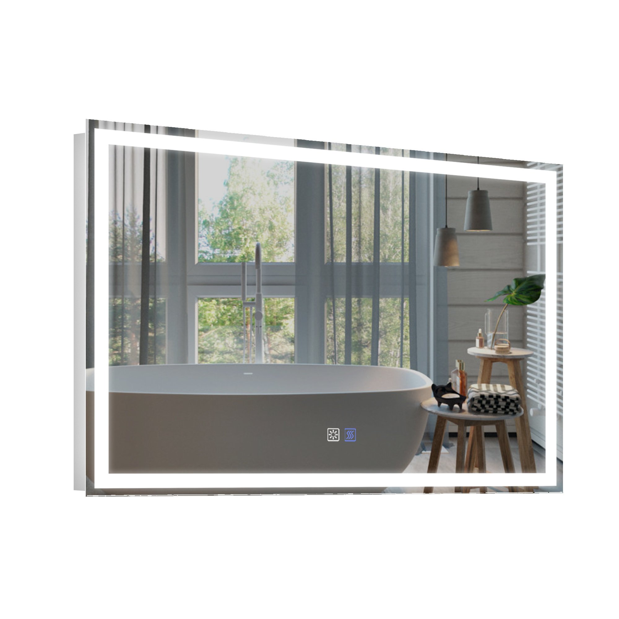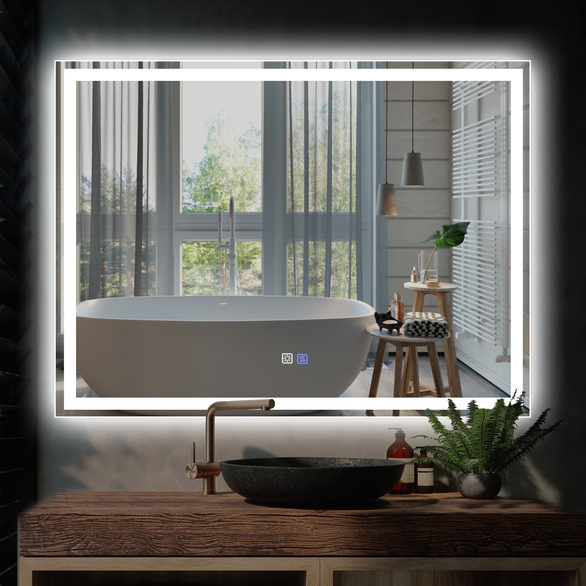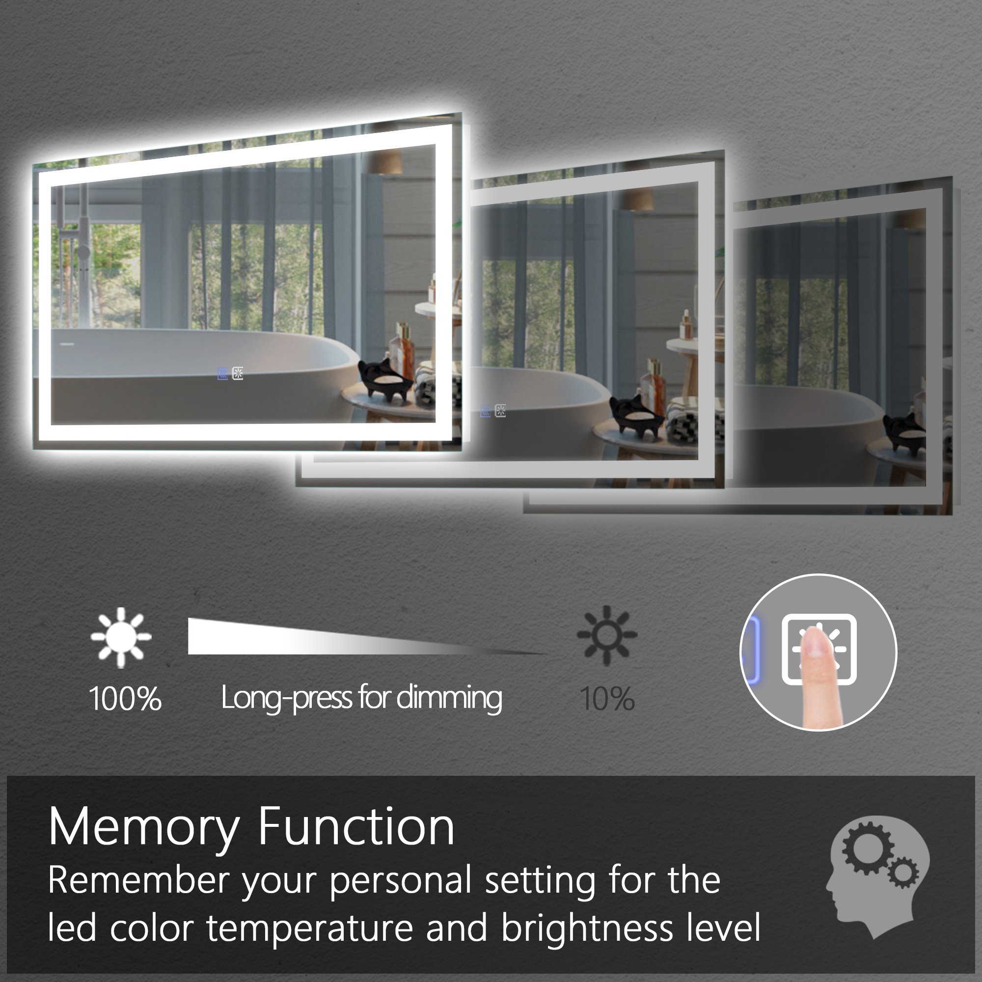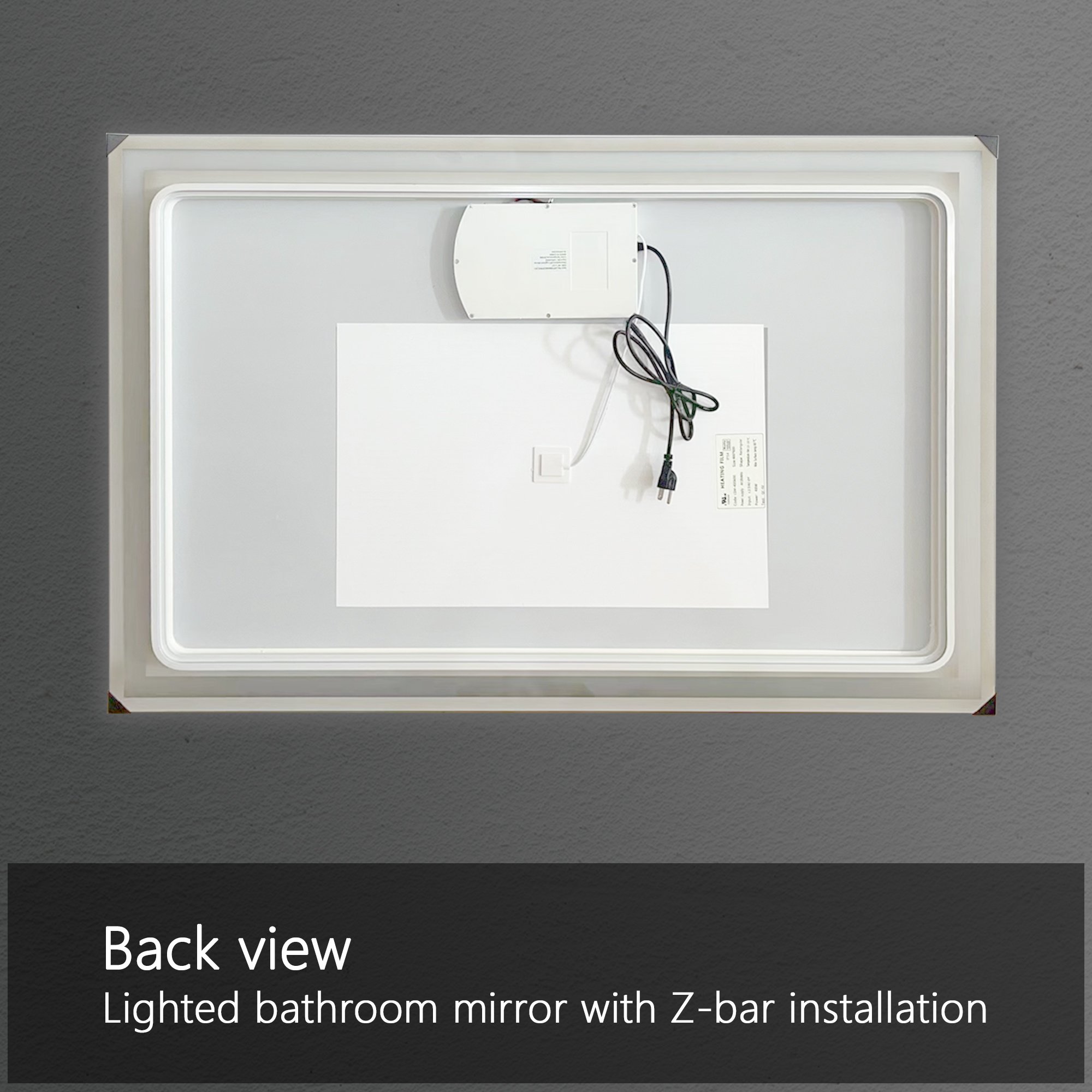 ●Experience the Luxury of a Bathroom at Home:You may have seen large, gorgeous LED bathroom mirrors in hotels and restaurants. Now, you can bring the same modern feeling to your own home with our LED bathroom mirror. Transform your powder room into a Hollywood star's makeup space and enjoy a bathroom that will impress friends and family.●Enhanced Visibility with Anti-fog Technology:Our LED mirror for bathroom comes with an anti-fog feature, providing a clear reflective lighted bathroom mirror experience even in a foggy bathroom. Say goodbye to water droplets or fog that blur your LED bathroom mirror. The individually designed anti-fog switch ensures safety and energy efficiency. You can easily turn it on or off according to your needs.●Easy Installation with Z-Bar Wall Brackets: Our Z-Bar hanging installation makes it a breeze to securely mount the large bathroom mirror on your wall. No more measuring multiple times or drilling numerous holes in your wall, which can be unsightly. Our installation method ensures an attractive and hassle-free setup.●Adjustable Lighting for the Perfect Ambience: Our Bathroom Mirror With Light offers color temperature 5000K. Adjust the brightness of the bathroom mirror with lights from 15% to 100% lumens to suit your preferences. ●Safety Enhanced with Explosion-proof Film: Our LED bathroom mirror with lights uses safe and high-quality explosion-proof glass. In the event of breakage, the bathroom vanity mirror will not produce hazardous glass splinters, providing added safety and peace of mind.●Backlit+Front-lit, Double Lighting Sources: Our LED bathroom mirror is designed with both backlight and front light. Double lighting sources designed to make the mirror bright enough for you to do makeup, skin care, shaving and dressing up. Super bright.