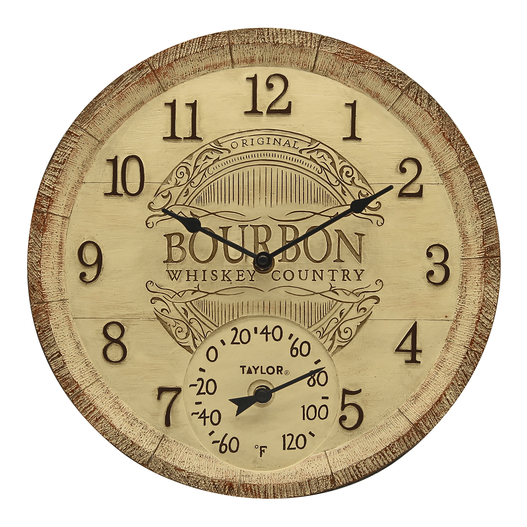 Taylor’s 14-inch bourbon barrel poly resin clock with thermometer is a beautiful addition to the patio, garden or even basement bar. The rustic bourbon barrel design is hand painted and uv resistant, the colors will stay rich even in the outdoor elements. Precision made coils measure temperature between -60 degrees f to 120 degrees f, making it ideal for indoor or outdoor use. The easy-to-read clock features quartz clock movements for accurate time measurement. 1 aa battery (not included) is required for the clock function.